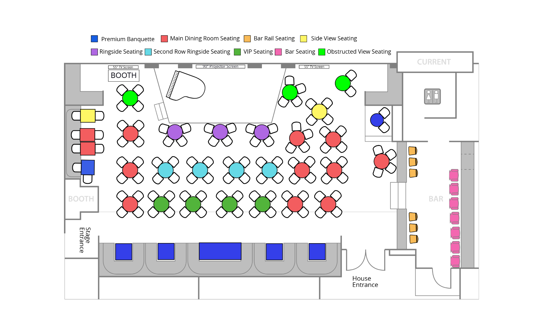 Premium Seating guarantees you either a booth that accommodates up to 5 guests OR the only table for two. Premium Seating is also cabaret style, depending on the size of your party.